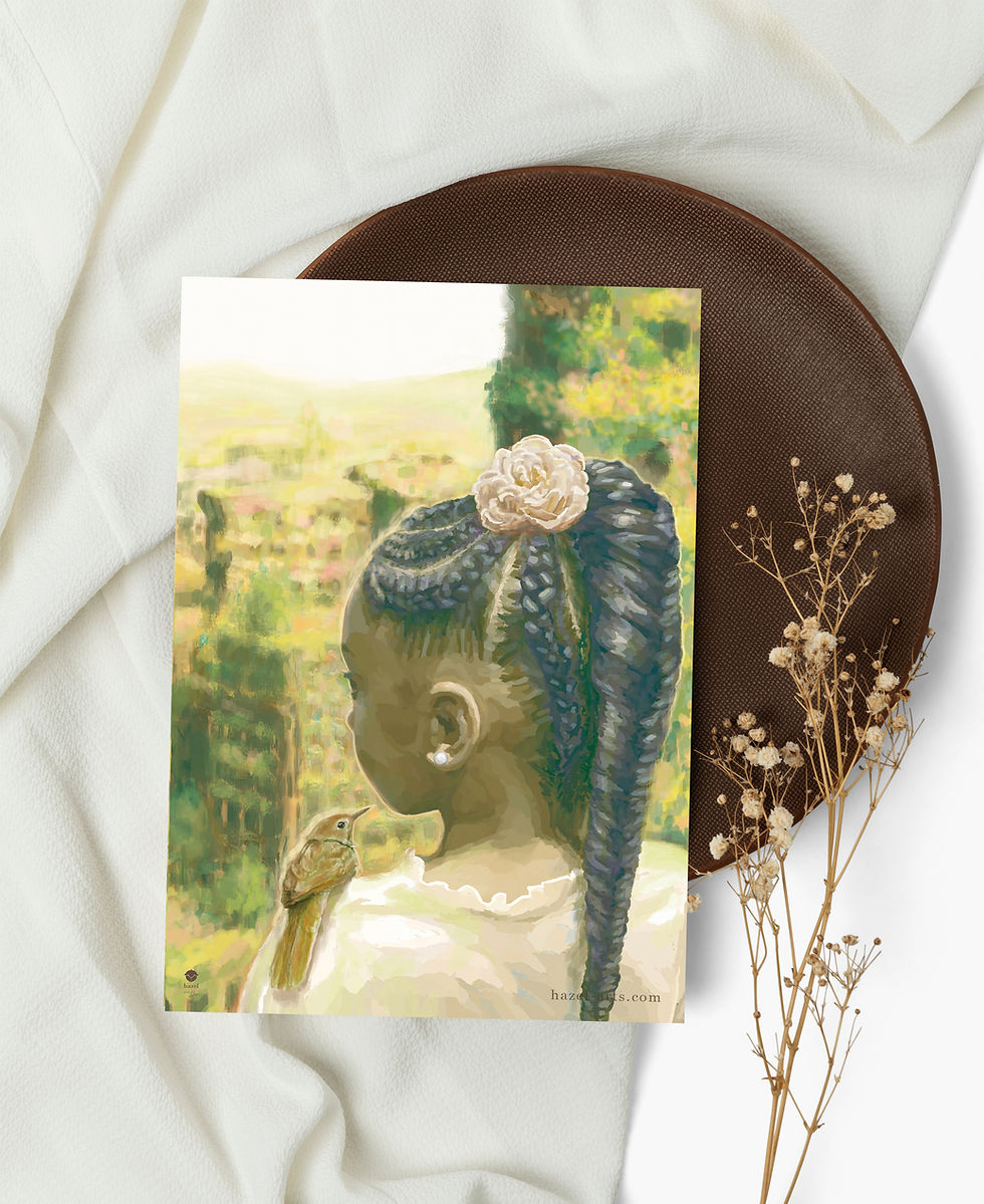 Dieses Motiv ist Teil der Serie „Hazel“, die die Verbindung zwischen Mensch, Tier und Natur in einer verträumten, utopischen Welt erzählt.